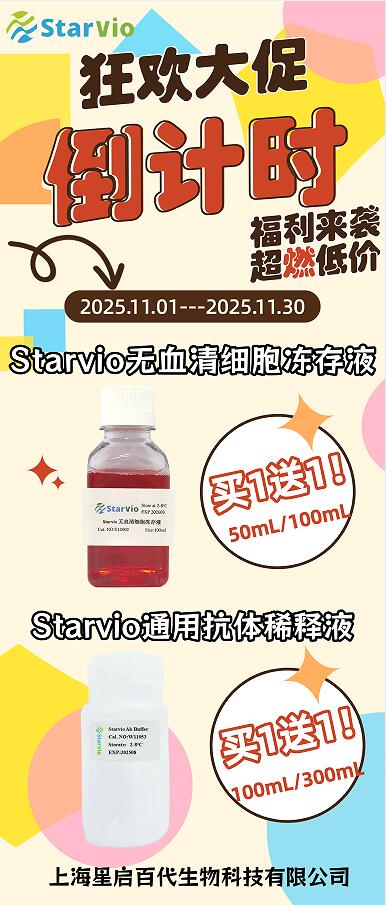 2025年11月1日 - 11月30日,星启百代Starvio系列科研试剂钜惠登场!Starvio无血清细胞冻存液(50mL/100mL 规格) 买 1 送 1,助力细胞冻存更高效;Starvio通用抗体稀释液(100mL/300mL 规格) 同样买 1 送 1,让抗体实验更精准。超燃低价,错过再等一年,科研人们快抓住机会,为你的实验助力加码!